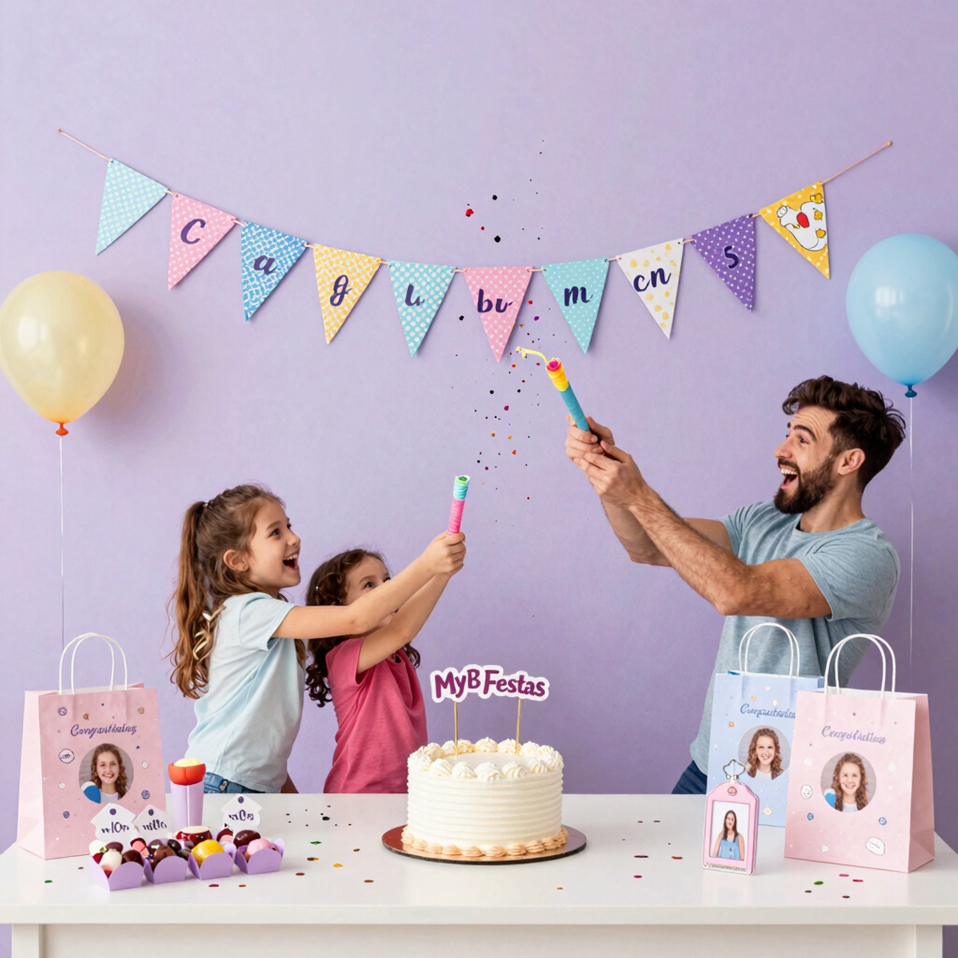 Papelaria personalizada para festas: topos de bolo, caixinhas, sacolinhas, bandeirolas, tags para docinhos, adesivos e muito mais — tudo feito sob medida para deixar sua comemoração única e inesquecível.